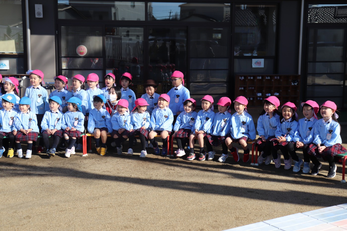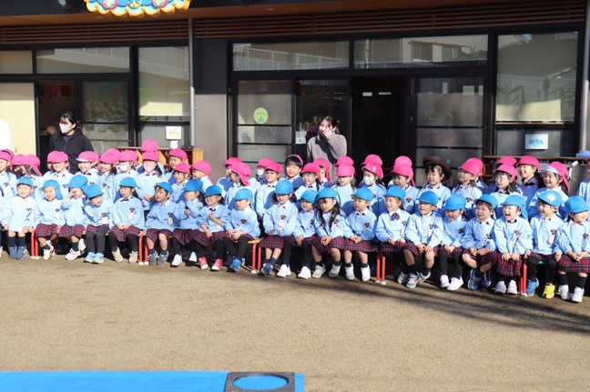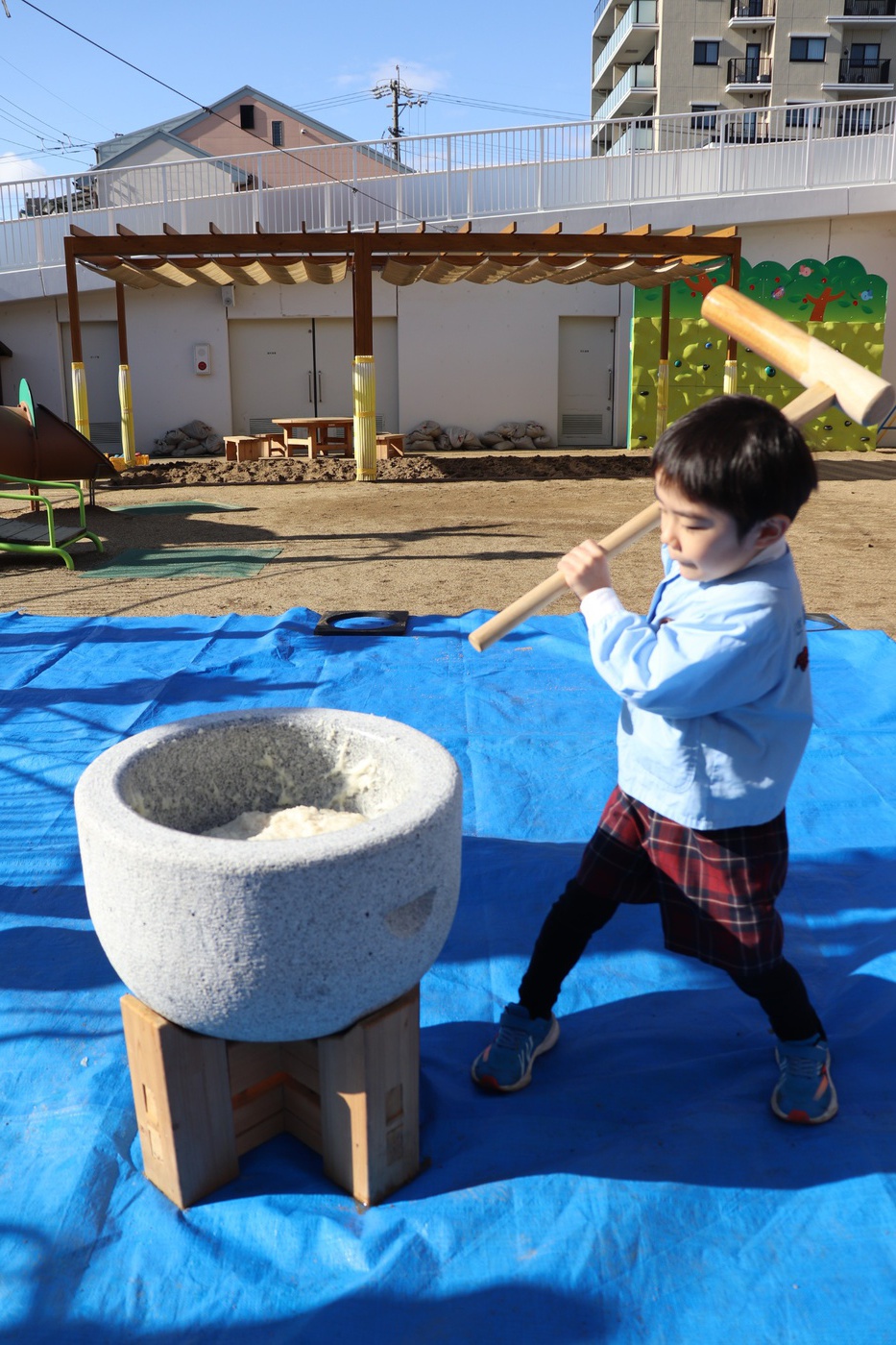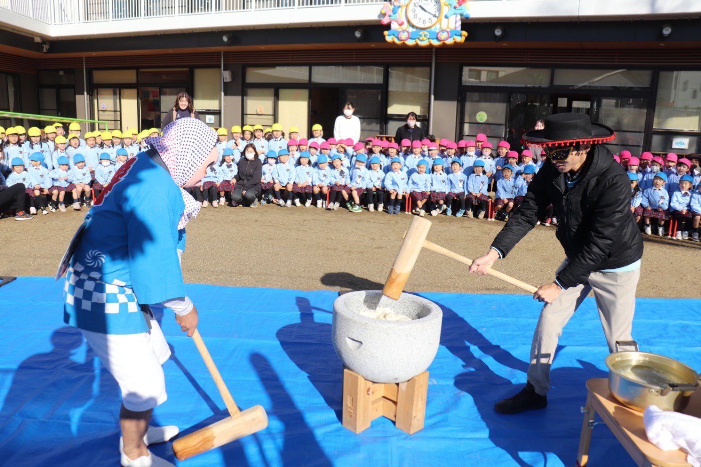 2025年12月17日(水) おもちつき 12月15日に年末恒例のお餅つきを行いました。 餅つきの由来を先生から聞き、お餅をついてくれるゲストさんを迎え、お餅つきがスタートしました。天気にも恵まれ、青空の下子どもたちの元気な「よいしょー!」という掛け声が響きました。 付いたお餅は鏡餅にして、皆で写真を撮りました。 皆が新年を元気で迎えられますように。