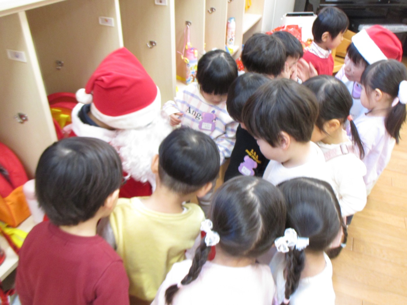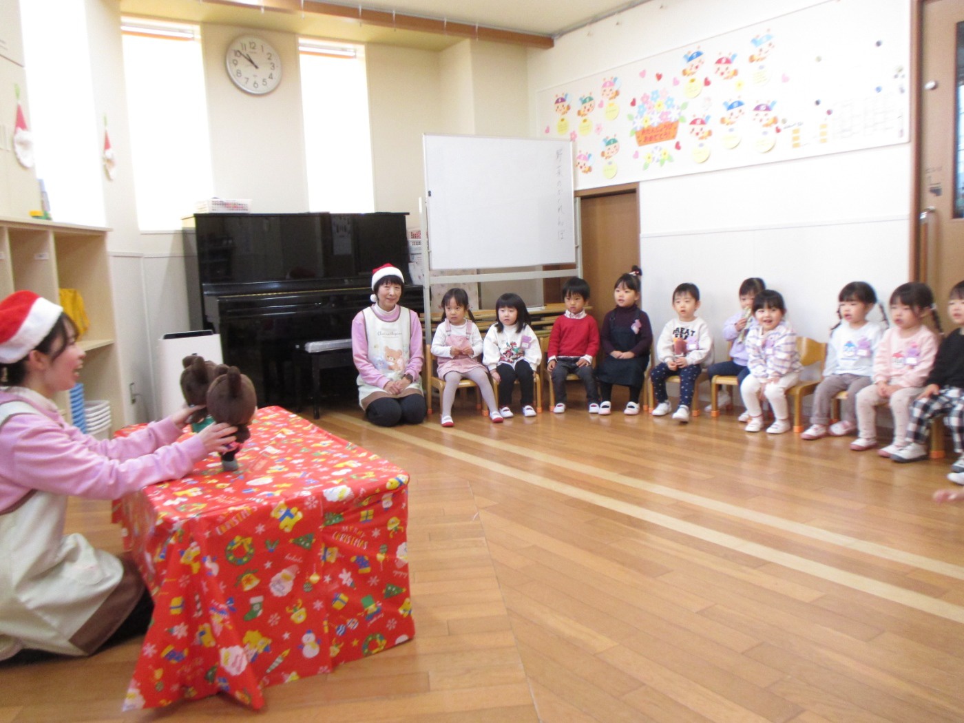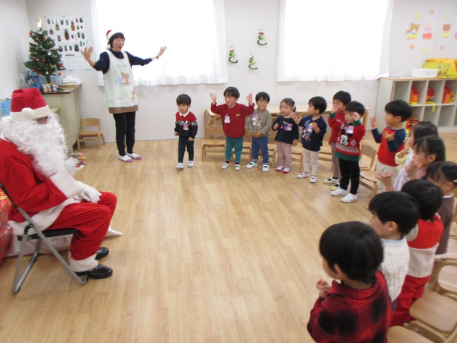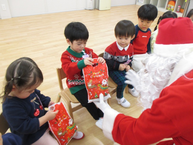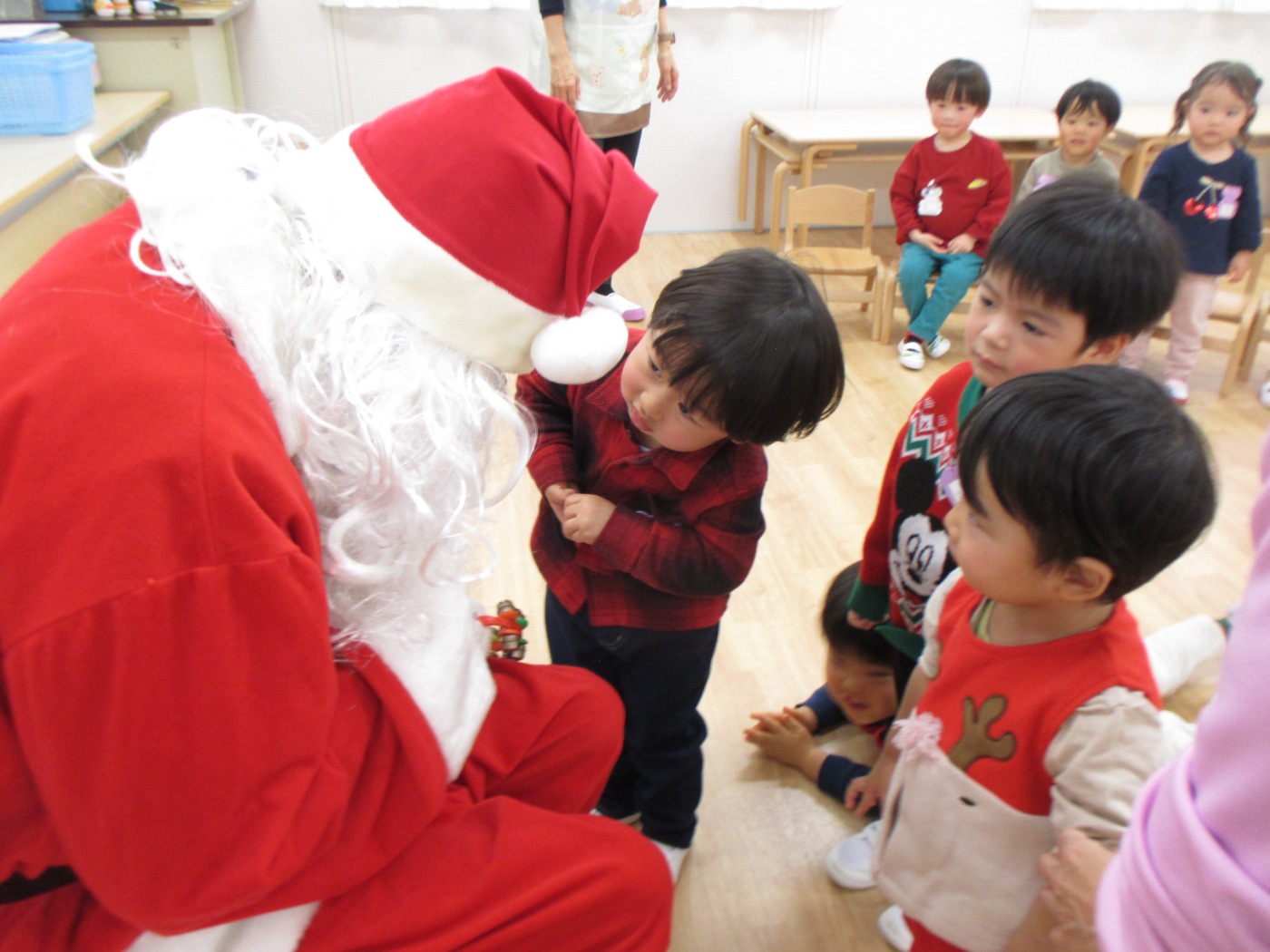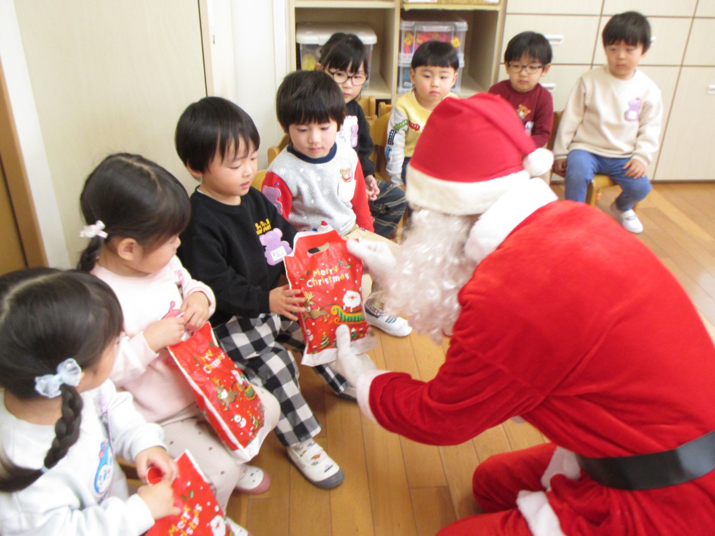 2025年12月22日(月) たんぽぽ・こっこ教室クリスマス会 12月16日(火)にたんぽぽ教室、17日(水)にこっこ教室のクリスマス会を行いました。どちらの教室も初めて会うサンタクロースに驚きと嬉しさでいっぱいの様子でした。サンタクロースへの質問では「〇〇が欲しいです。」と質問ではなく一生懸命自分の欲しいプレゼントを伝える姿がかわいらしかったです。また子どもたちから歌のプレゼントをして、最後に一人ずつサンタクロースからプレゼントをもらい、素敵な一日を過ごすことができました。 たんぽぽ教室 こっこ教室
