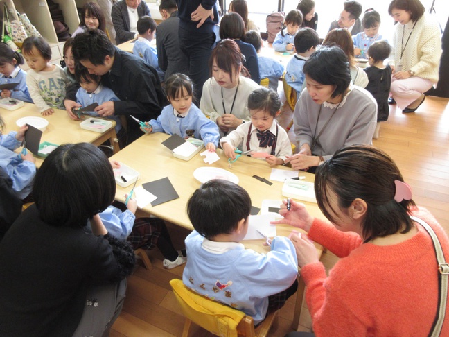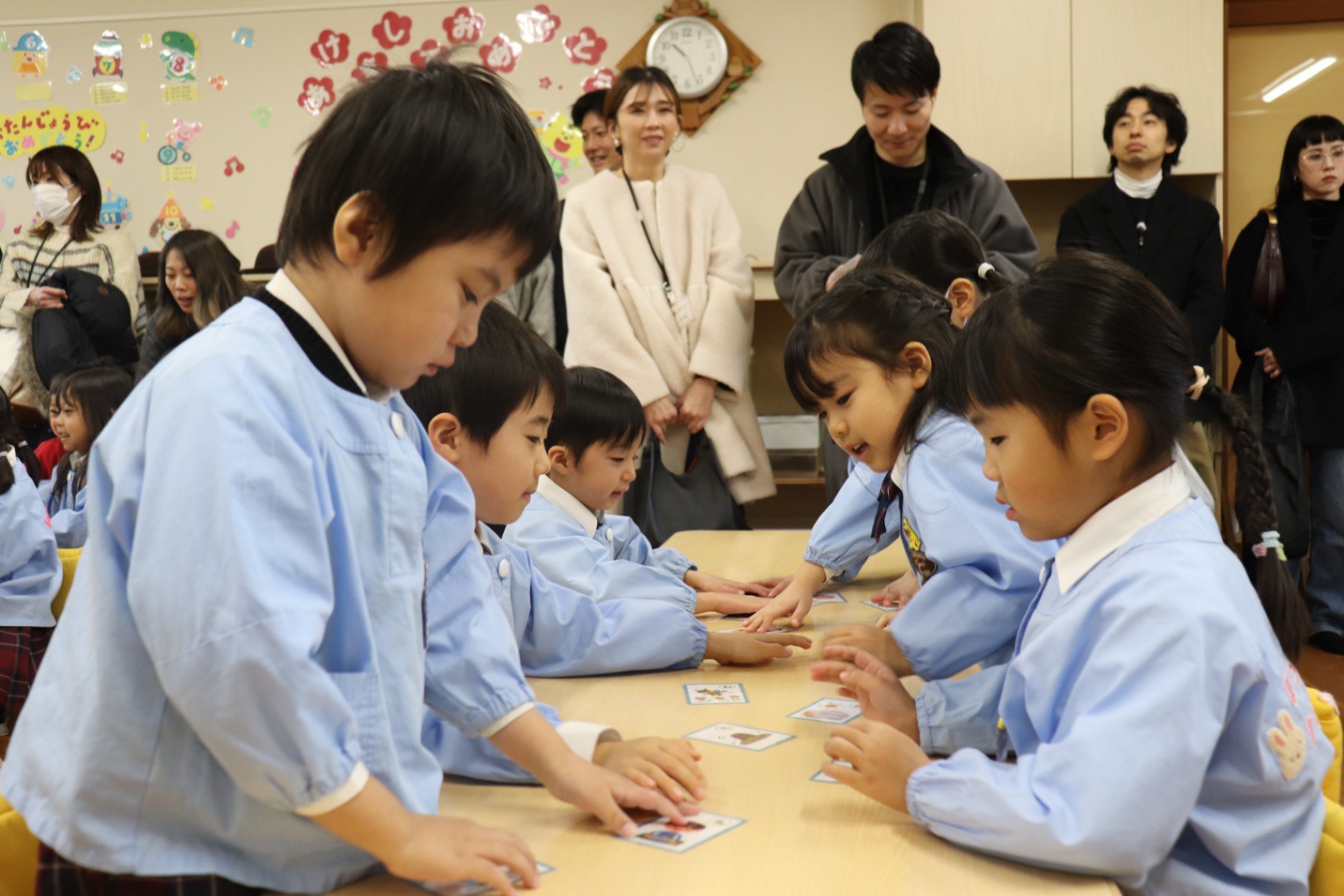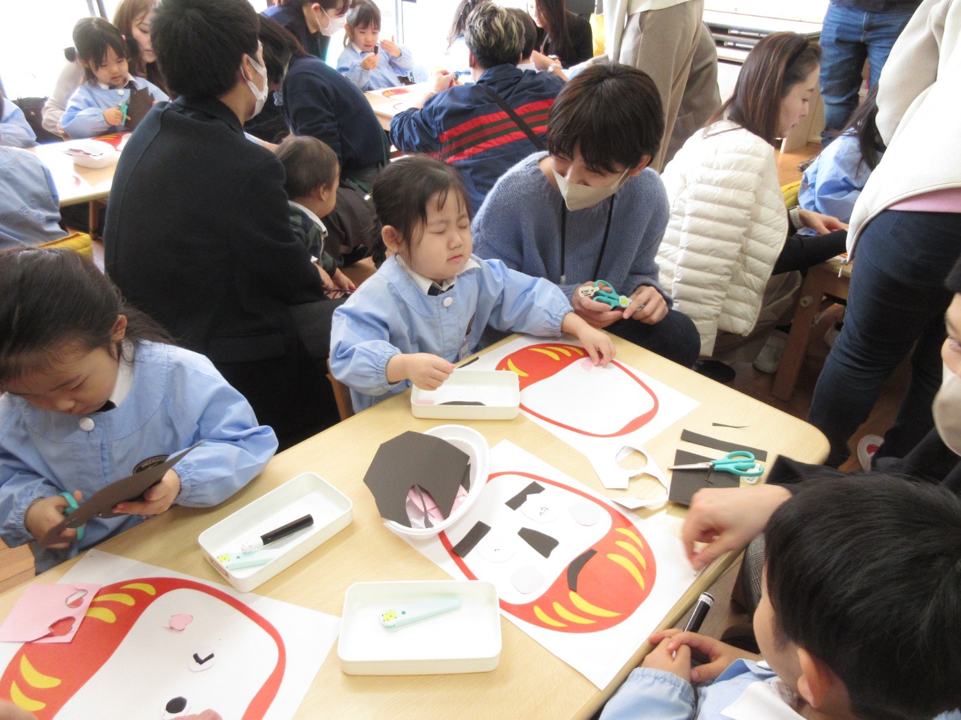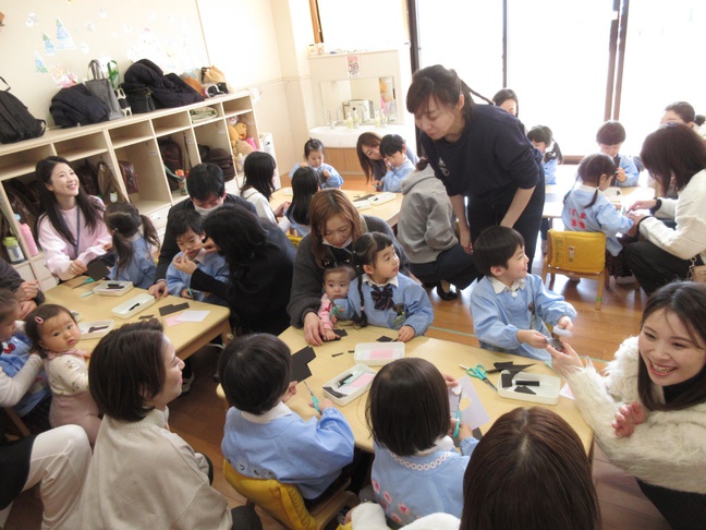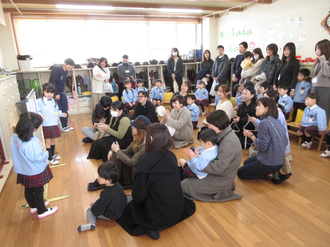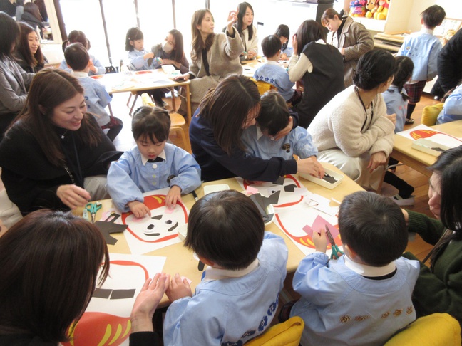 2026年01月29日(木) 保育参観 14日~16日の3日間で最後の保育参観を行いました。 1日目は年長組で、かるた作りをして遊びました。読み札を保護者の人と一緒に考え、その後作ったかるたで遊びました。いろいろな言葉を考え、面白いかるたができました。その後もお部屋で楽しんで遊んでいます。 2日目は年中組で、楽器遊びを行いました。保護者の方にも参加していただき、子どもたちもとても楽しそうでした。 3日目は年少組で、製作を行い、はさみの使い方を保護者の方に見ていただきました。