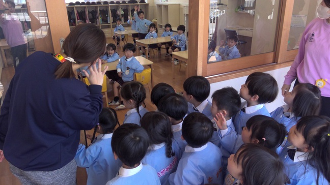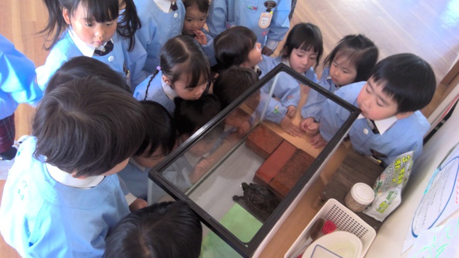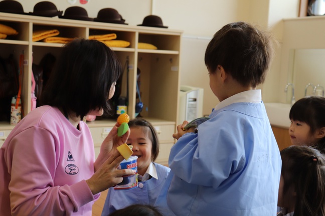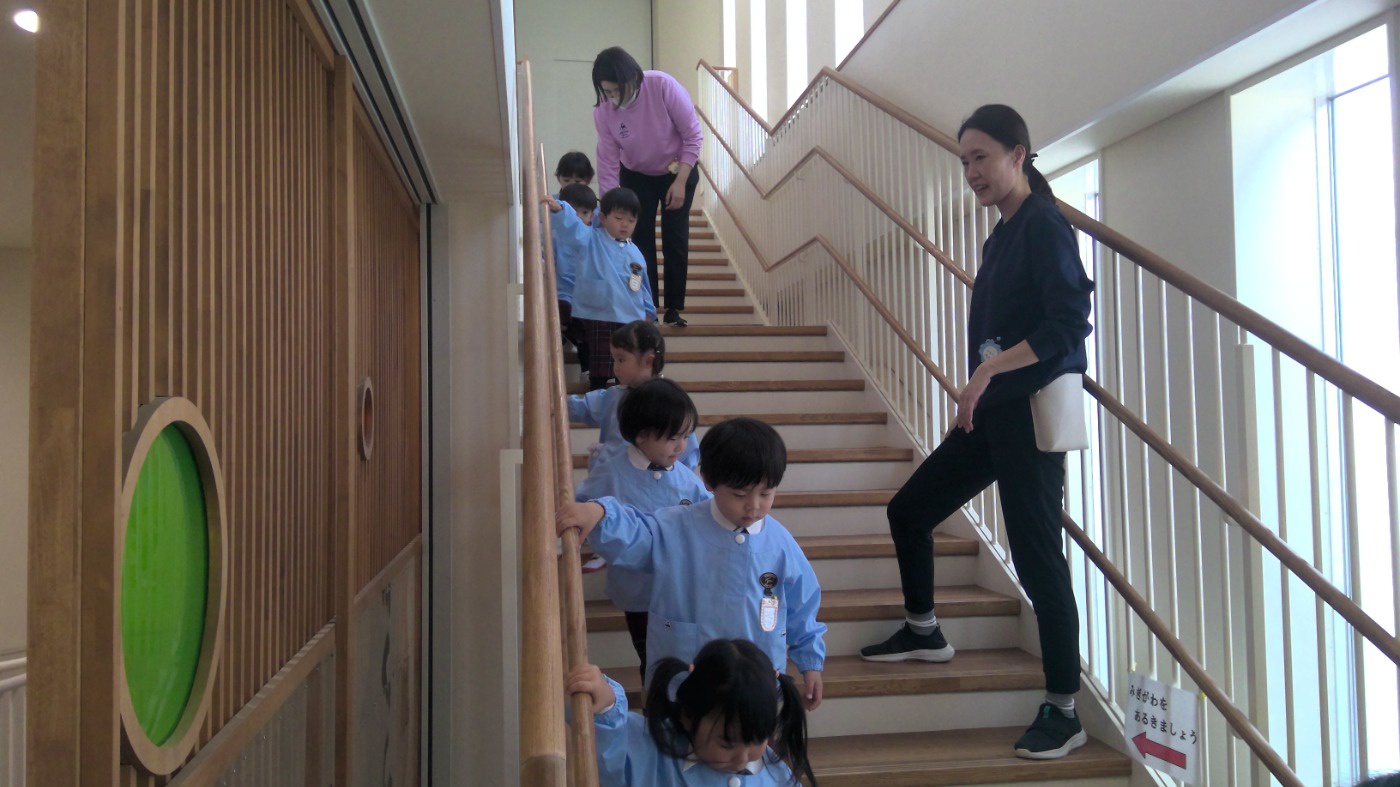 年少さんは園内体験に出かけていました。2階のお部屋を見たり、かめきち君に挨拶をしたりして楽しそうでした。