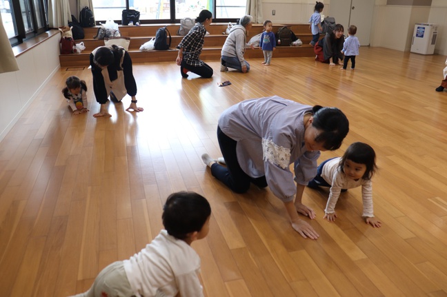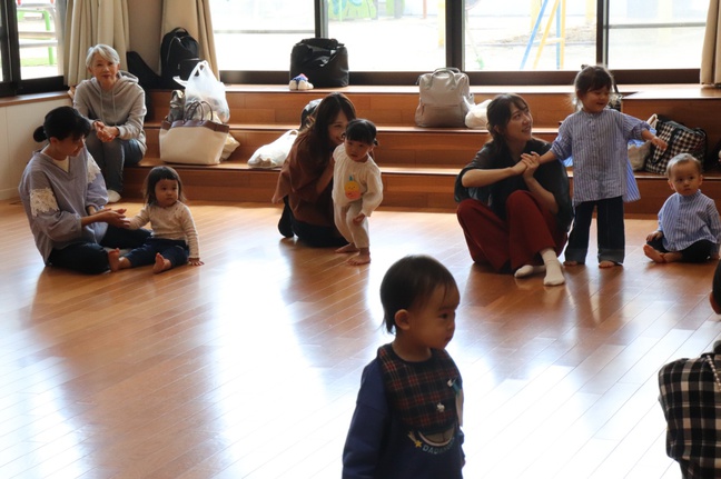 秋晴れの気持ち良い一日。ひよこ教室では、講師の岡先生のリズム遊びをしました。
