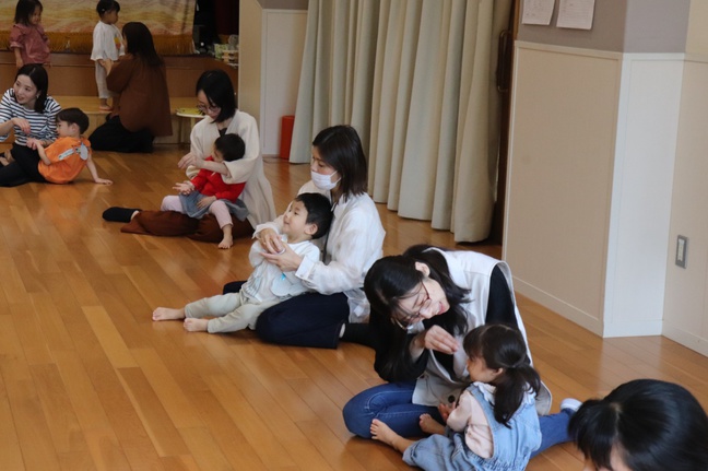 10月生まれのお友だちの誕生日会を予定していましたが、誰もいなかったため、新聞紙遊びをしました。沢山遊んだ後、ビリビリ、フワフワとお友だちと交わって、解放感もいっぱいでした。最後はボールを作って、お母さんとキャッチボールをしました。