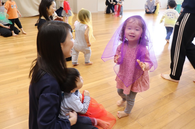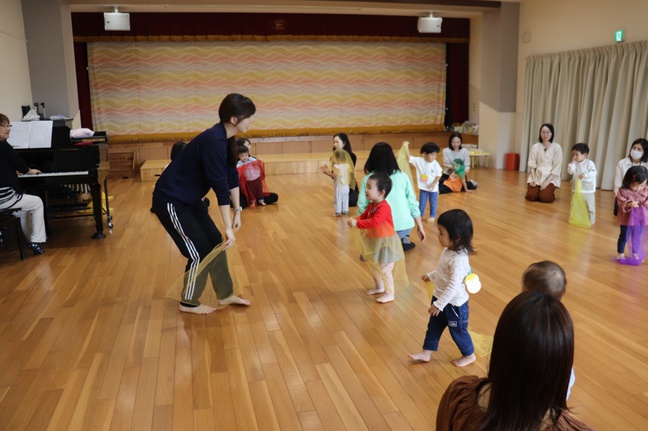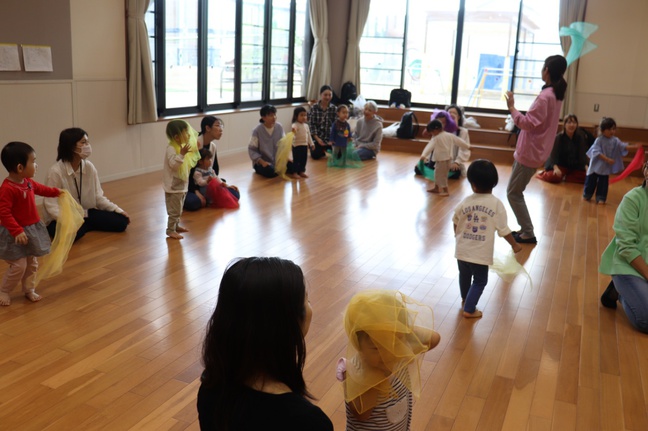 ピアノのリズムに合わせて歩いたり走ったり、また、音色に合わせてそれぞれの感性で身体表現を楽しみました。秋色のスカーフをなびかせることがとても気持ち良く、みんな笑顔になりました。