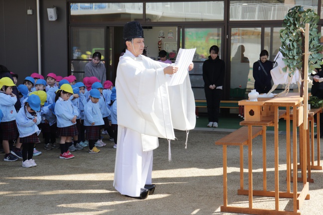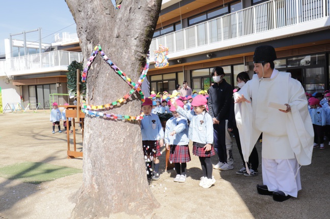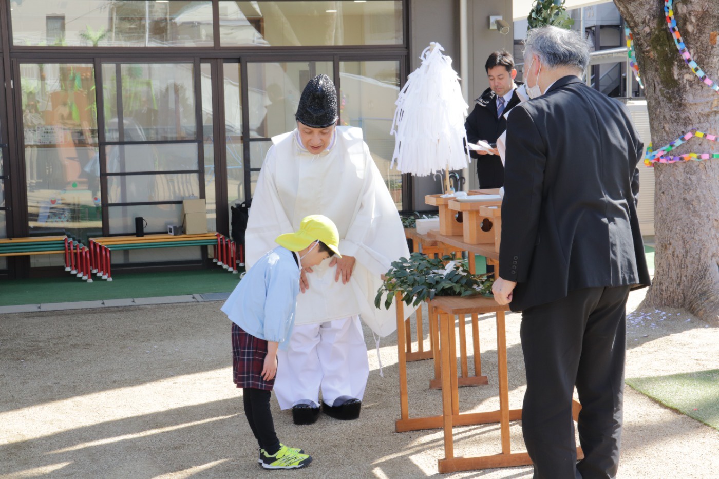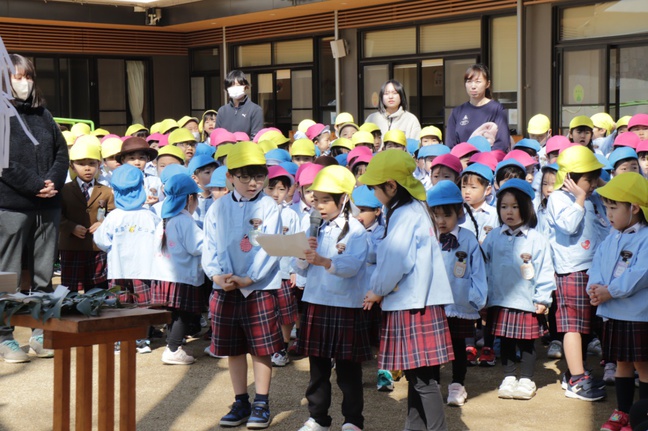 神主の方にも来ていただき、職員のほかに代表の子どもたちにも切麻を撒いたり玉ぐしを奉納してもらいました。年長の代表の子が「けやきの近くでいろいろな思い出ができました。日向ぼっこや、ありを探したり、鬼ごっこでけやきの木に隠れたりして楽しかったです。長い間ありがとうございました。」と感謝の言葉を伝えてくれました。